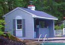 Typically a fully enclosed, standalone structure located somewhere near a swimming pool, to offer a restroom and a changing area as a minimum. A bathhouse can also have its own kitchen, living area, game room, and more. (See also Cabana.)