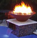 Offers a stunning flame effect, which is nice in the daytime, but even more impressive at night. Fire bowls are typically 2 feet or larger in diameter, and can be made from any number of materials, including stone, metal, concrete, ceramic, and more. The fire bowl is normally filled with crushed glass, lava rock, or some other fireproof material, to hide the gas fixture inside the bowl. The ideal fire bowl is automated, and can be lit instantly with a touch of a remote control. A fire wok is essentially a fire bowl built on top of a water wok. (See Water Wok.)