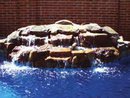 Most popular as a simple arching waterfall that comes out of a raised sidewall of the swimming pool, a sheer descent might also be mounted overhead, to produce a "waterfall" effect. (See also Rain Wall.)